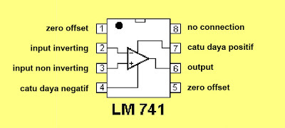 LM741 adalah salah satu IC (Integrated Circuit) Op-Amp (Operational Amplifier) yang memiliki 8 pin. IC Op-Amp ini terdapat 2 jenis bentuk, yaitu tabung (lingkaran) dan kotak (persegi), tetapi yang umum adalah yang berbentuk persegi. Op-Amp banyak digunakan dalam sistem analog komputer, penguat video/gambar, penguat audio, osilator, detector dan lainnya. LM741 biasanya bekerja pada tegangan positif/negatif 12 volt, dibawah itu IC tidak akan bekerja. Setiap pin/kaki-kaki pada IC LM741 mempunya fungsi yang berbeda-beda, keterangan pin/kaki-kaki LM741 dapat dilihat pada gambar dibawah ini.